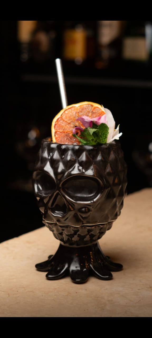 Jägermeister, jugo de lima, gin beefeater, vodka de maracuyá, helado de pomelo.