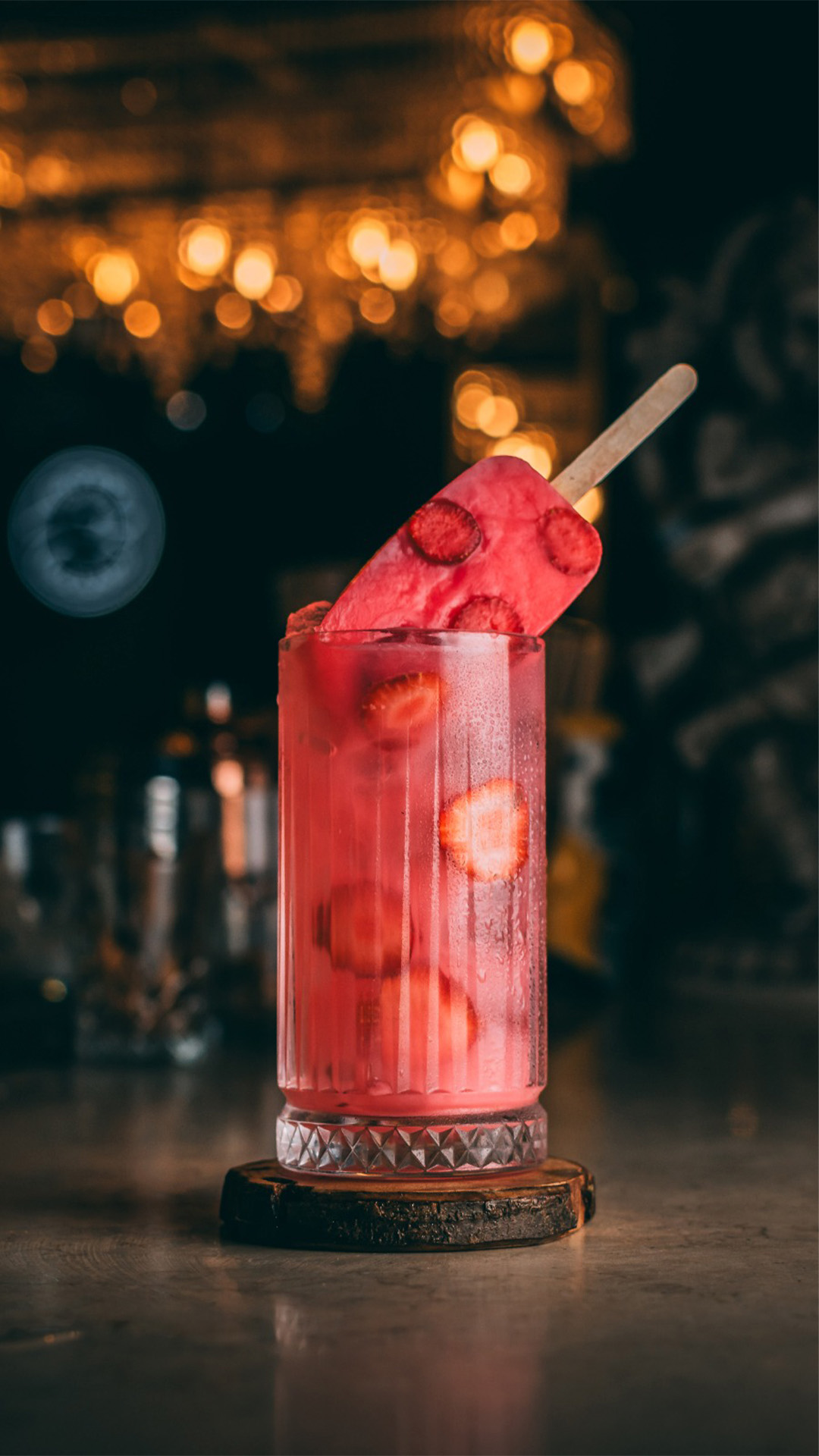 Gin Heraclito, láminas de fresa, palito helado de flynn paff y tónica schweppes