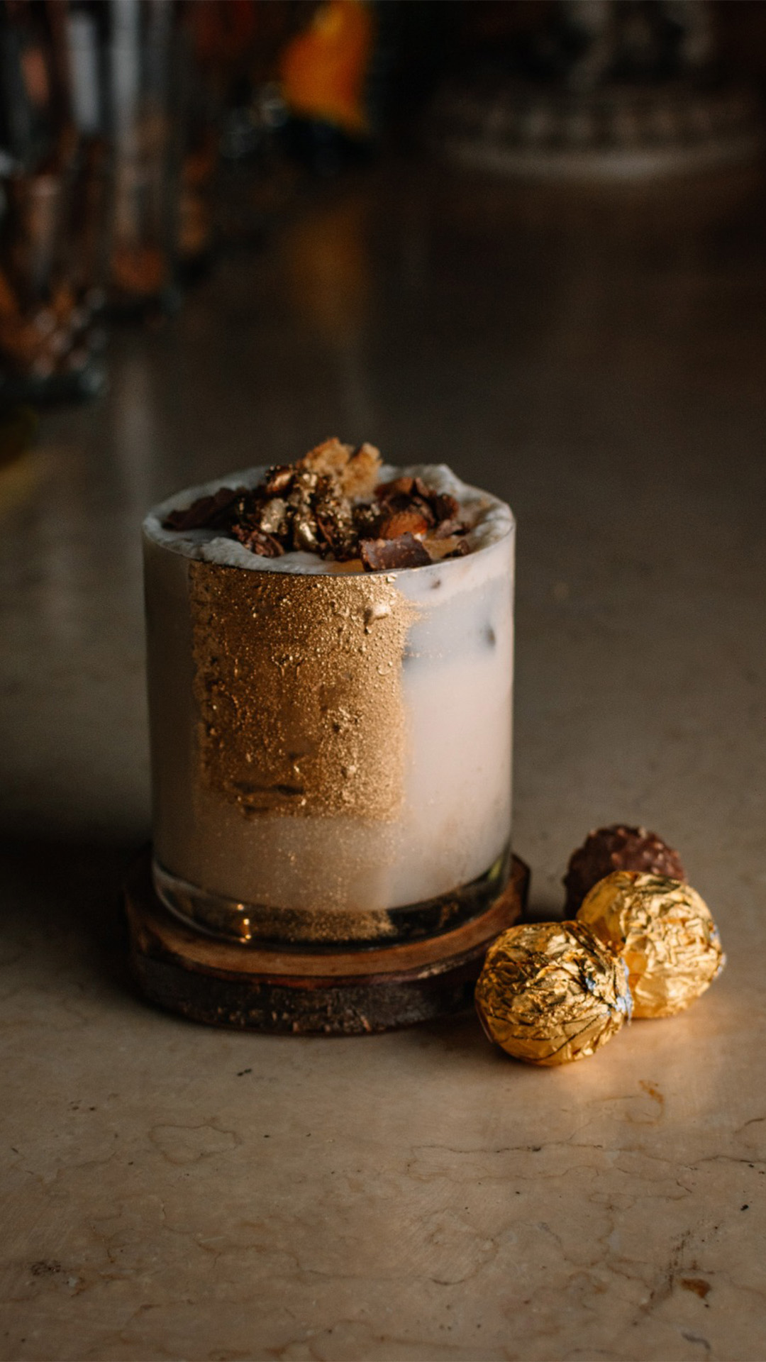 Brandy, baileys de banana split, crema, chocolate blanco, frangelico avellana y chips de ferrero rocher